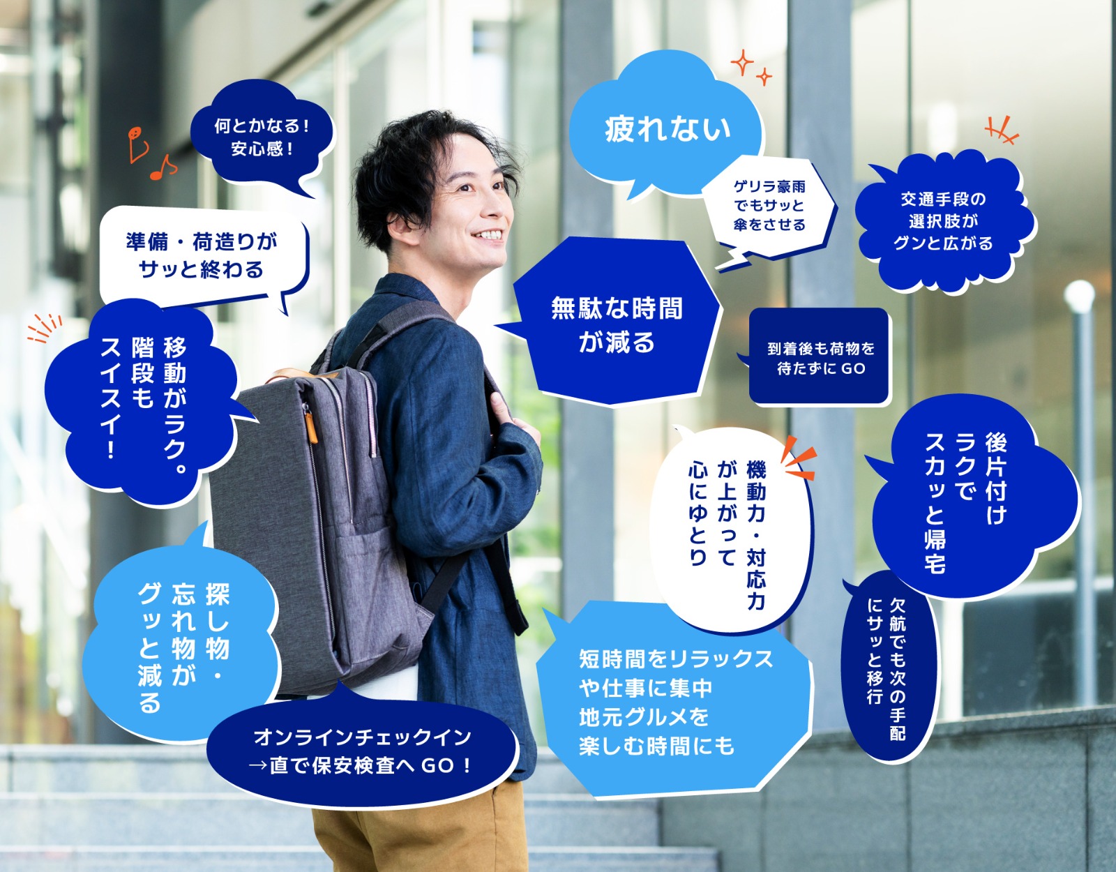 しかし、コツカンエアロダクトを活用し、手荷物を減らすことで、交通手段の選択肢が広がり、荷物を預ける手間も省けます。