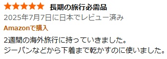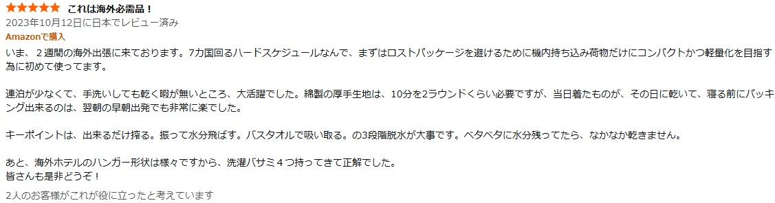 そんな洗濯が手間なく簡単にできれば、衣類は最小限で済むけれど、旅先での洗濯には、手間と乾くかの不安が残ります。